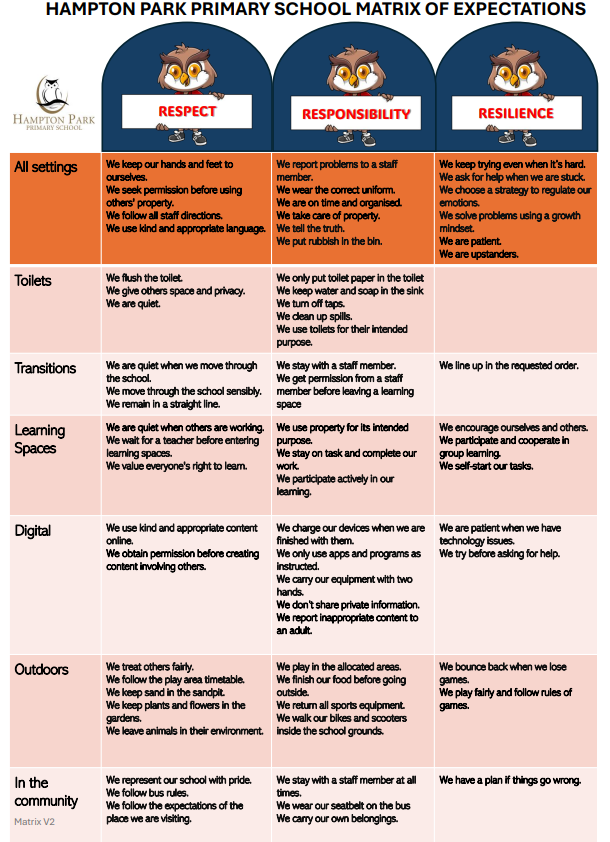 By embedding these practices throughout our school, we aim to build a culture where all students feel safe, valued, and empowered to succeed. We encourage parents to reinforce these expectations at home and celebrate your child’s achievements in demonstrating positive behaviours.